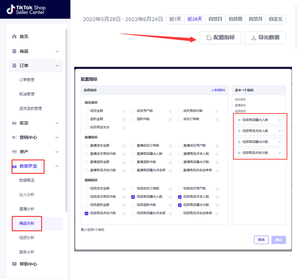 第一:小店后台侧-数据罗盘-商品分析-配置指标-选择这四项指数