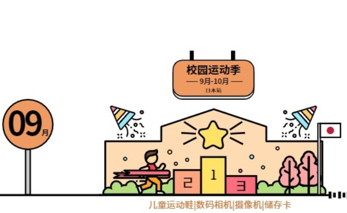 九月迎来返校季日本站校园运动季,针对类目(儿童运动鞋,数码相机,摄像机,储存卡)