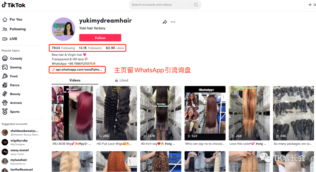 我们点击其中一个账号,可以进入到账号主页,该账号在主页有留WhatsApp的联系方式,客户可以直接加WhatsApp沟通。