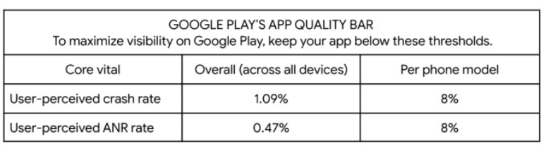 Google Play 对于一款 App 或游戏的质量的评判是从多个角度出发的,其中技术层面的指标是最重要的。据悉,Google Play 正在部署一项新的"质量指标",当某款 App 的崩溃率(crash rate)和"应用程序无响应率"(ANR)的值超出标准的时候(具体标准如下图所示),谷歌就将会把这款 App 认定为"低质量"App,并且将其排除在 Google Play 的某些展示区域之外,比如推荐区域等,甚至 Google Play 还有可能在这些 App 的应用商店详情页中做出"警告"提示,以此来引起用户对于这类 App 的注意。
