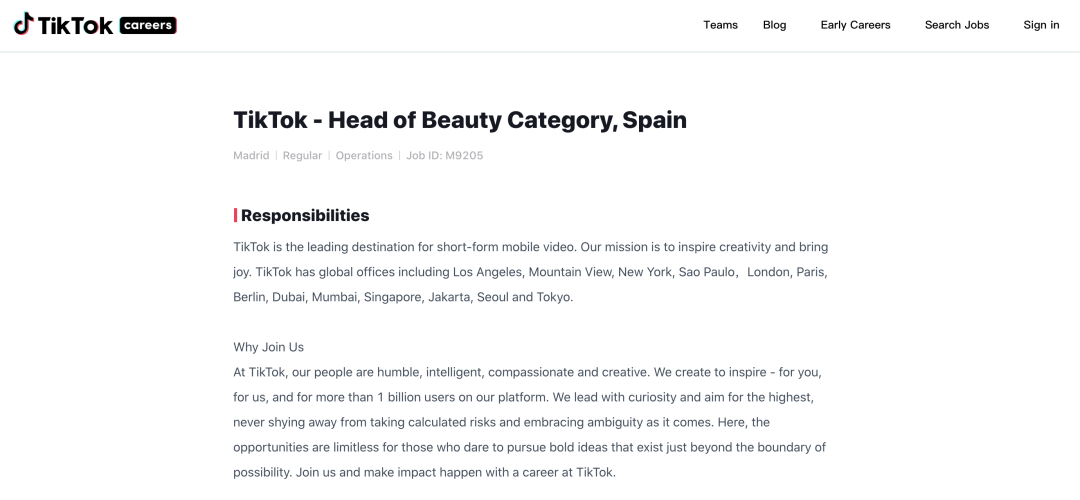 据悉,TikTok 目前在官网发布了面向西班牙市场的美容品类主管等职位,Base 马德里。要求具有 10 年以上美容和个护电商业务经验,3 年以上管理经验,有电商经验者、与品牌和经销商有紧密联系者优先。