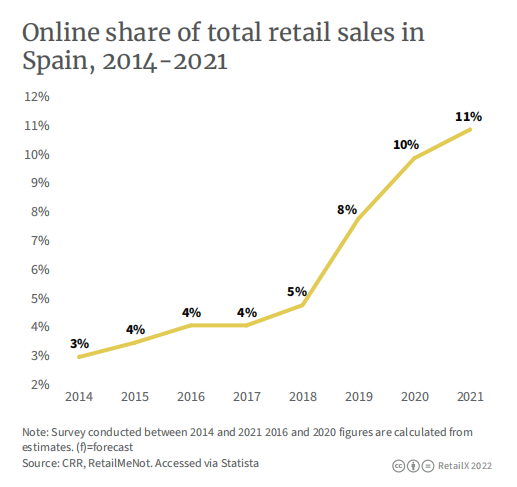 根据 RetailX 发布的报告显示,疫情前的 2019 年,西班牙线上零售额占零售总额的 8%,两年之后,也即 2021 年,这个数字也才升至 11%。